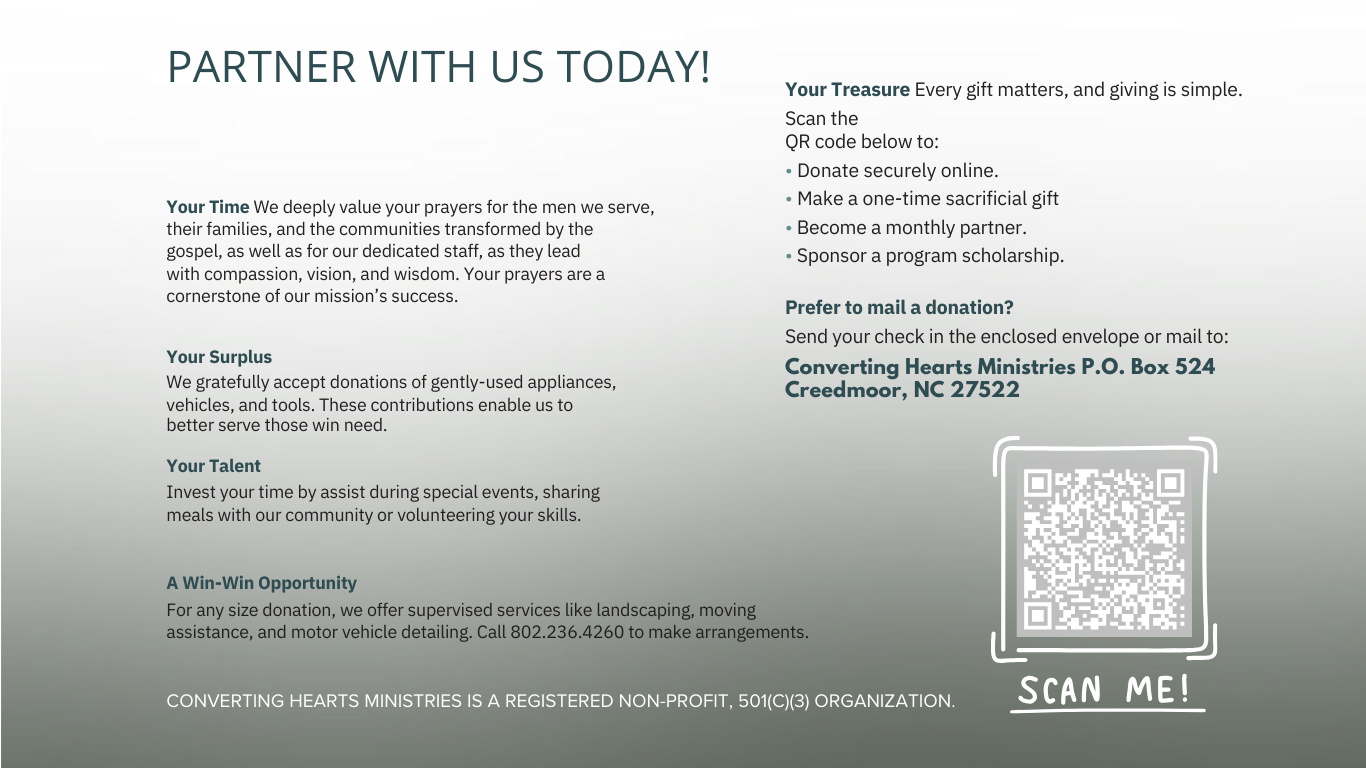 Converting Hearts Ministries was founded in 2007 by Carlton and Wayne Edwards situated in rural North Carolina. Although our farm-based facility primarily serves Wake and its surrounding counties, CHM has rescued hundreds of men from the state and continues to grow in popularity all throughout the Nation. CHM is a live-in facility meeting each individual where they are to provide hope and guidance with the love of Christ.